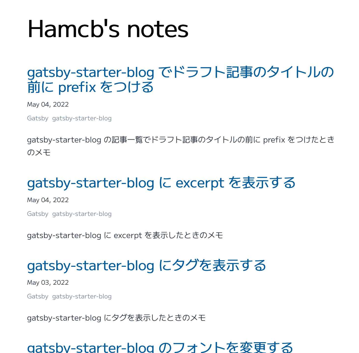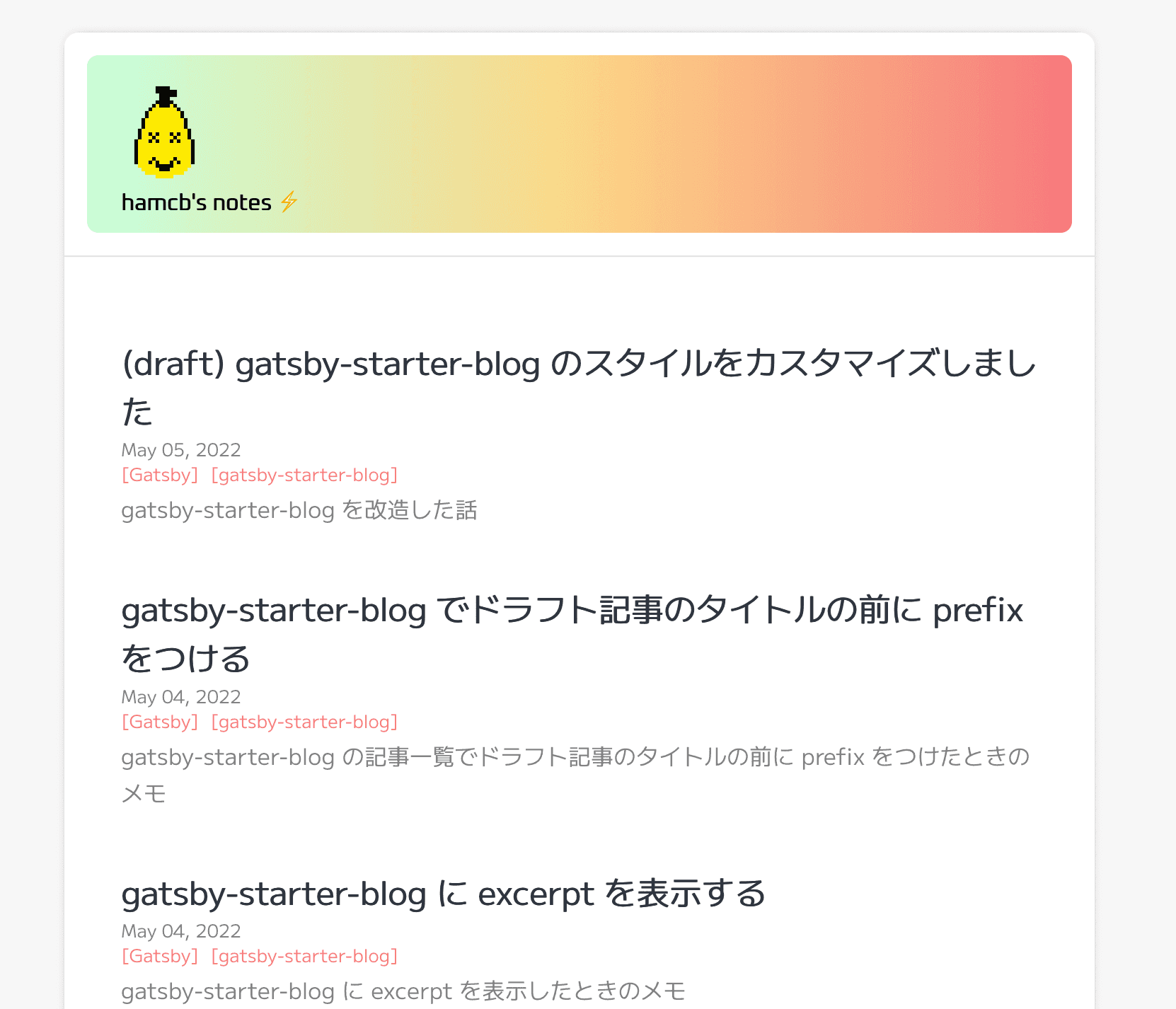 スタイルの変更ではないがタグを表示させるようにしていたり excerpt の表示を frontmatter のものを使うようにしていたり(こちらはもともと gatsby-blog-starter に実装されていたのでそれを使うようにしただけ)という変更をした。