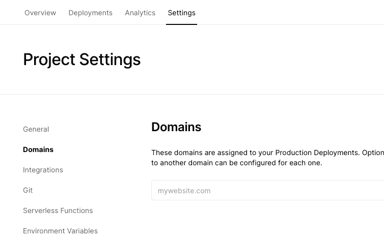 Vercel でドメインを設定するには、プロジェクトの Settings > Domains を選択してドメインの設定画面を開きます。
